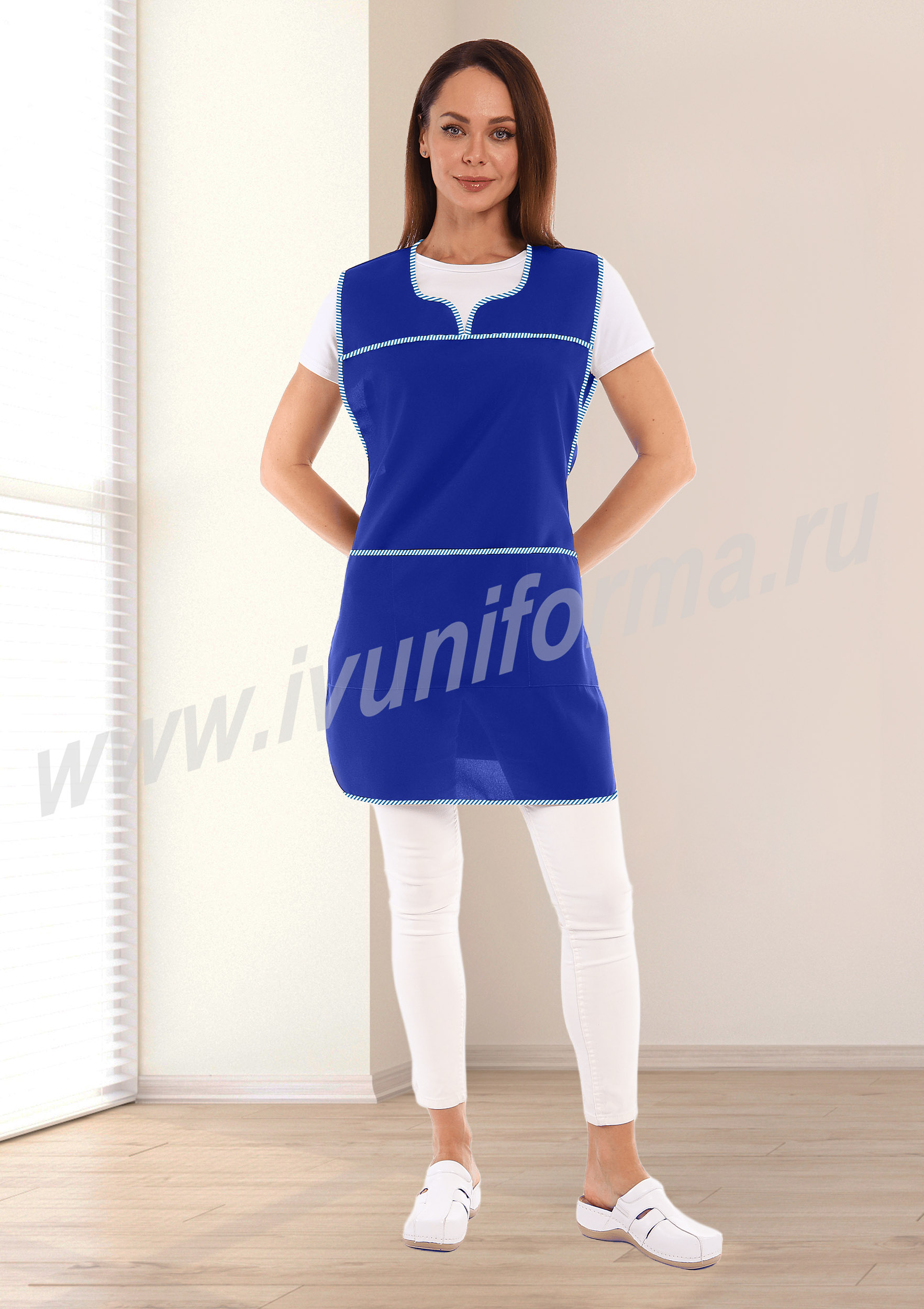Фартук средней длины, перекидной, имеющий спинку без отделки и полочку с отрезными симметричными кокетками. В нижней части полочки расположены вместительные карманы. Объем талии фартука регулируется завязками – поясами. Все срезы фартука обработаны кантом из контрастной капроновой ткани. Фартук предназначен для защиты от общепроизводственных загрязнений.